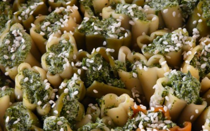-Fill the pasta with stuffing and arrange in a baking dish. Sprinkle with sesame seeds and bake to reheat the pasta.
