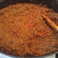 Saute onion and meat 5 minutes in hot oil. Mix in sauce. Simmer for 20 minutes.