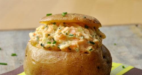 Whisk the egg whites until stiff, mix with the fill. Stuff potatoes with filling, put them in a baking dish 10 minutes in the oven preheated to 425F. The potatoes should swell slightly as soufflés. Serve hot.