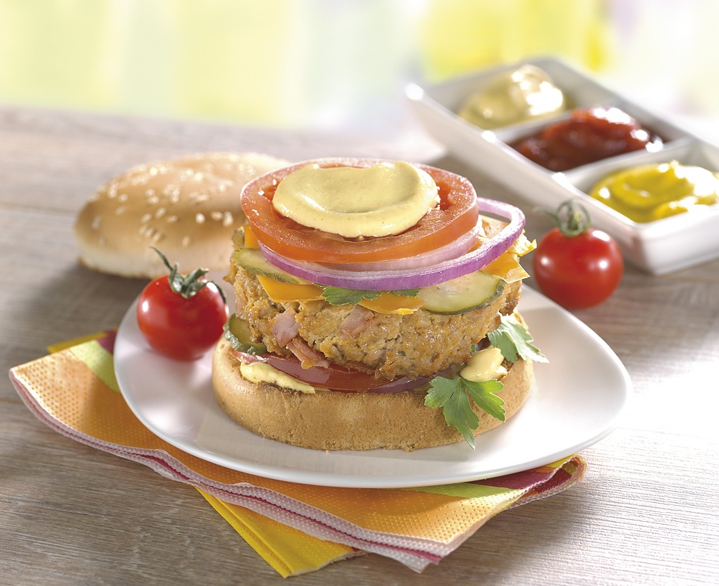 Assemble the burger in this order: bread- sweet mustard -1 slice of onion-1 tomato slice, 3 slices of pickles, a few leaves of parsley-meat-a few leaves of parsley-cheese slices -3 slices of pickle, a slice of onion, a slice of tomato- sweet mustard, bread.