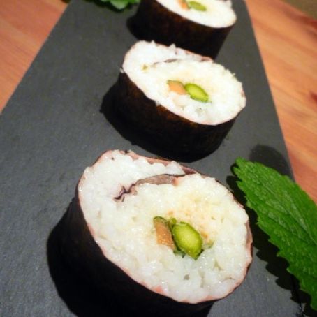 On the bottom put a strip of crab with mayonnaise. Place one or two sticks of carrot on top and a green asparagus. Place cut leaves of lemon balm. Fold the bottom of the mat with your thumb holding the trim with the rest of the fingers and roll.