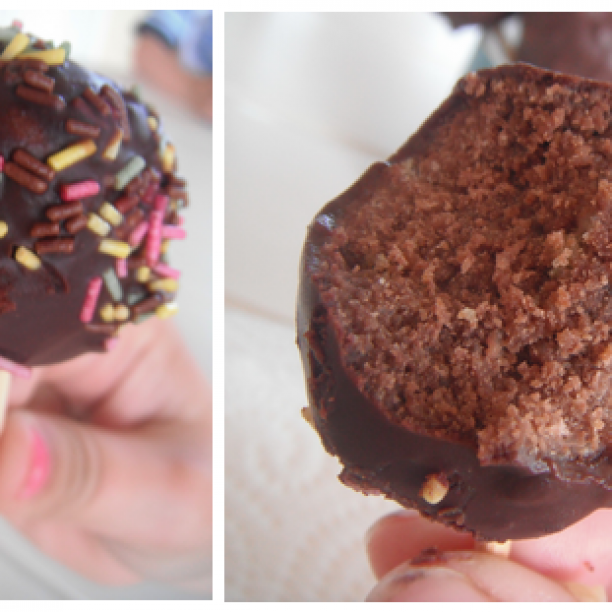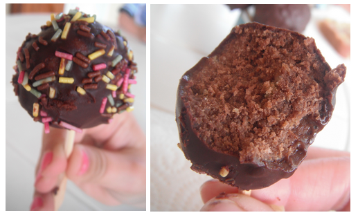 Melt the chocolate in the microwave for 30 seconds then dip the cake pops to coat with chocolate. Decorate as desired with sprinkles by color.