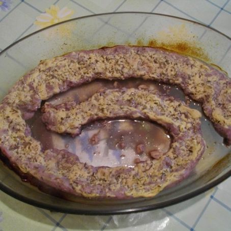 Open the entire length of the sausage and flatten well. Spread the sausage in a large dish that is oven safe. Add mustard.