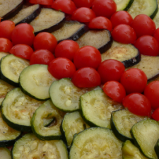 Place a thin layer of sliced potatoes in a lightly buttered baking dish, coat with a thin layer of cream cheese and pepper. Add a layer of well dried eggplant slices, add a pinch of finely chopped thyme then pour half the tomato sauce on the composition.