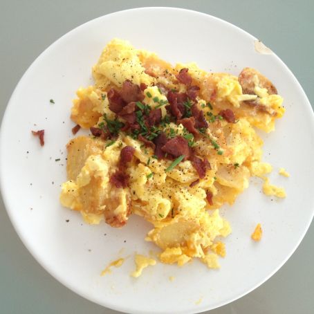 When you have finished cooking your potatoes beat your eggs in a bowl. Salt and Pepper. In a pan combine potatoes, eggs and cook. When eggs are half way done cooking, add cheese. Mix. Serve when eggs have reached desired doneness.