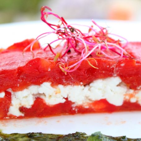 Assemble: use a round or mold if you have one. Cover the bottom of with tomatoes, then add the goat cheese and finish with another layer of tomatoes. Finally add the basil coulis.