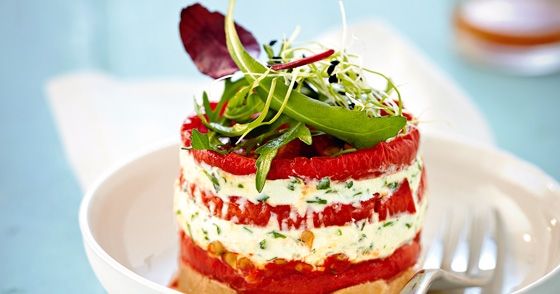 Roasted tomatoes with goat cheese and basil coulis. Discover our recipe.