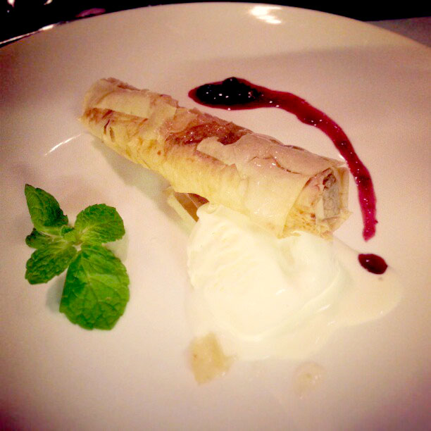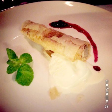 BAKLAVA CIGARILLAS with VANILLA ICE CREAM AND BLUEBERRIES
