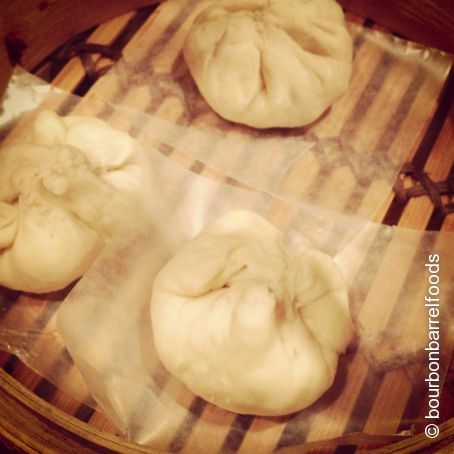For the assembly, cut dough into four chunks. Roll these chunks out into logs, and cut these logs into 1-inch slices. Flatten these slices into disks (make sure the middle part of the disk is thicker than the edges. With dry hands, fill the disk with pork filling and bunch the disk at the top as to enclose the pork. Place parchment on the bottom of the buns. Steam these buns for 10 minutes. Make sure they are not to close to each other (about two inches apart).