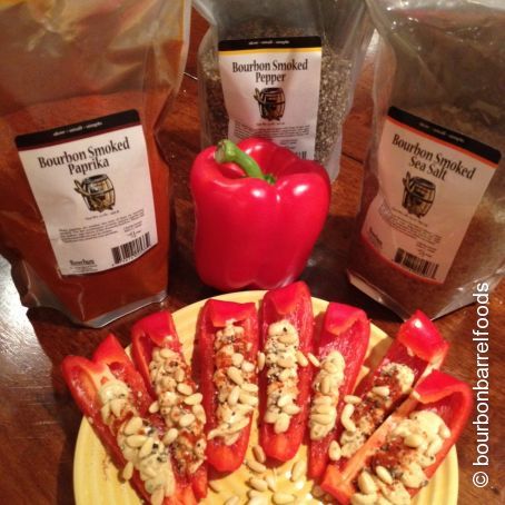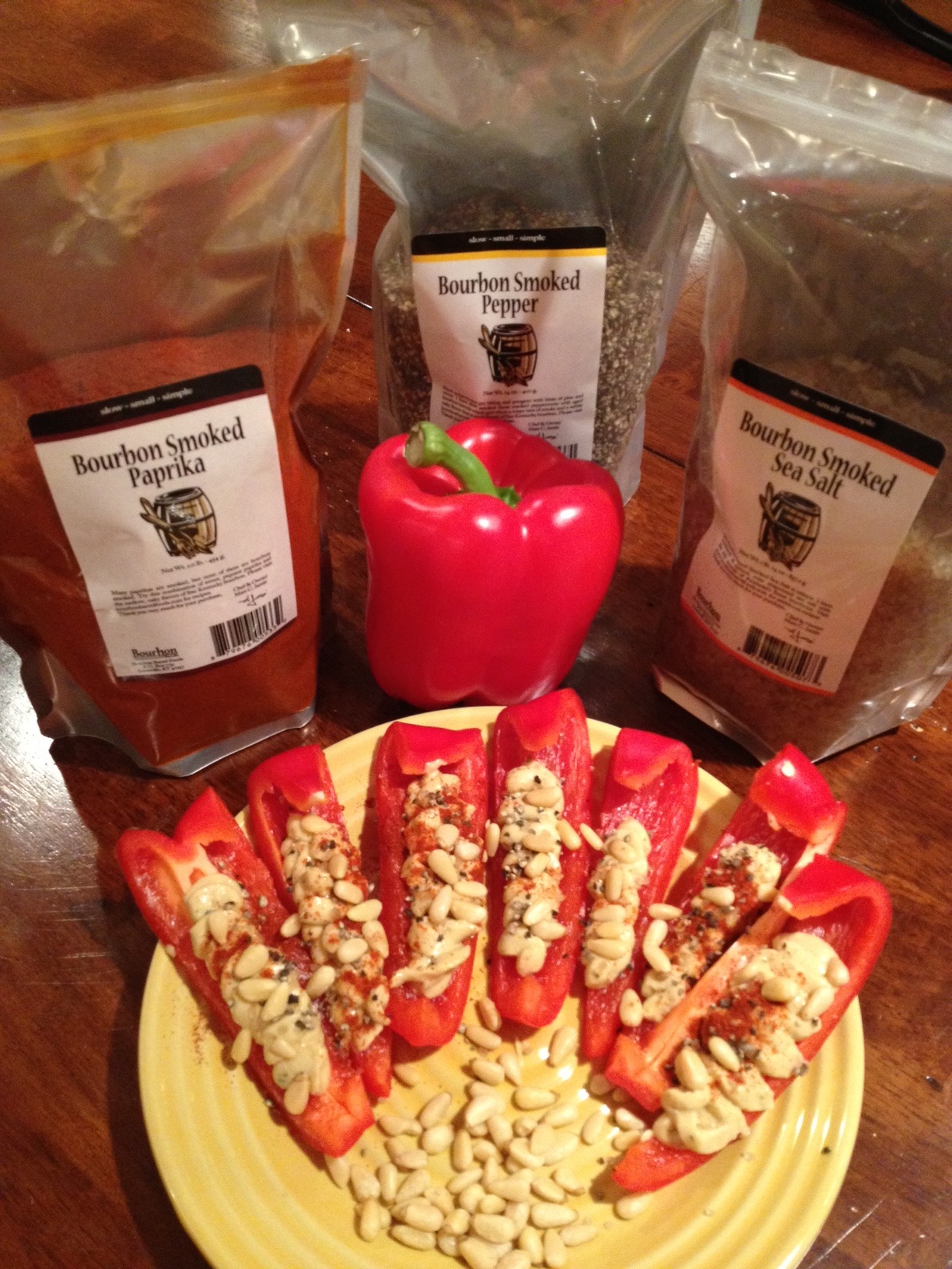 Cut bell pepper into 8 slivers and take out the seeds. Put the hummus in a sandwich bag or pastry bag, and pipe the hummus onto the pepper slivers. Top with toasted pine nuts, Smoked Black Pepper, Smoked Salt, and Smoked Paprika.