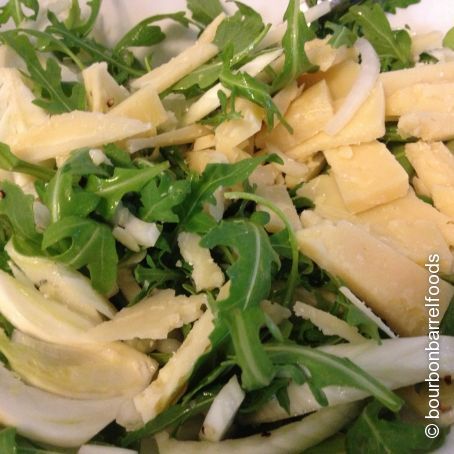 Mixed together fennel, onion, and arugula. In a separate bowl, mix together lemon juice, olive oil, Bourbon Smoked Pepper, and Bourbon Smoked Salt. Pour this mixture over the fennel, arugula, and onion. Top with thin slices of parmesan reggiano.