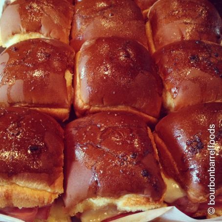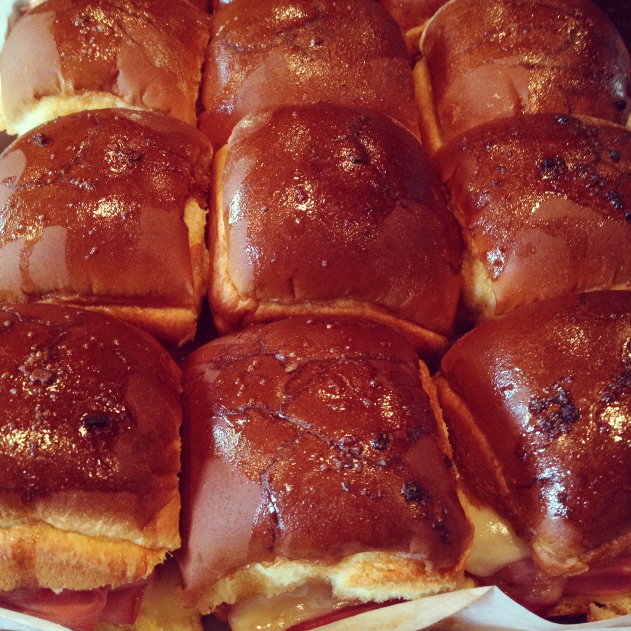 Make the sandwiches: 2 slices of ham and cheese on a bun, and place the buns in a baking pan lined with parchment. In a medium sauce pan, melt together the rest of the ingredients. Ladle this mixture over the sandwiches.