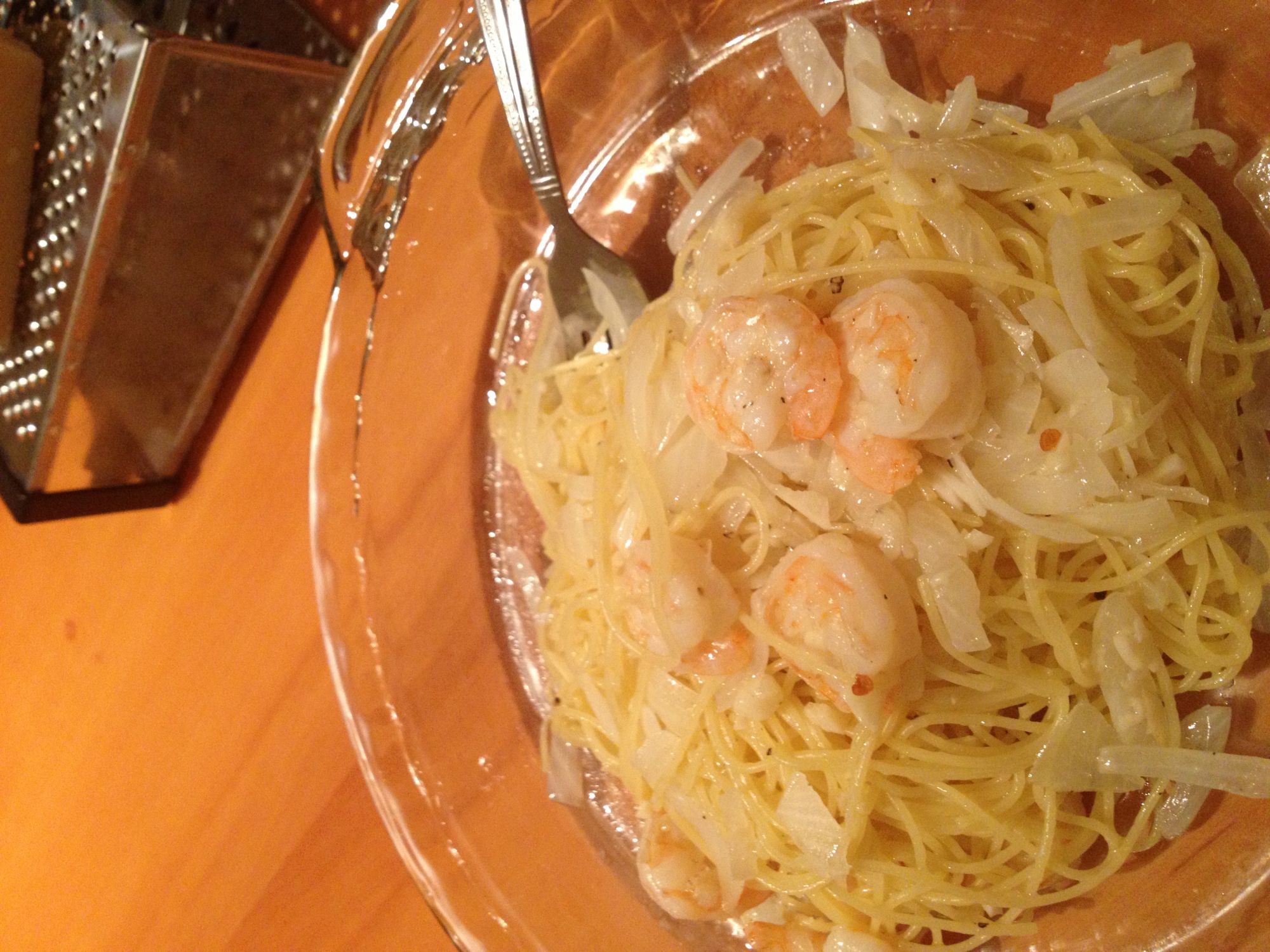 Heat olive oil in large skillet on medium heat. Add thawed shrimp and sear on one side for 1 minute. Add garlic and onion and stir frequently so the garlic doesn't burn. Sprinkle a small amount of salt and pepper, and squeeze the lemon into the skillet. The shrimp should be sizzling in the olive oil and lemon juice at this point and the onions will start to soften.