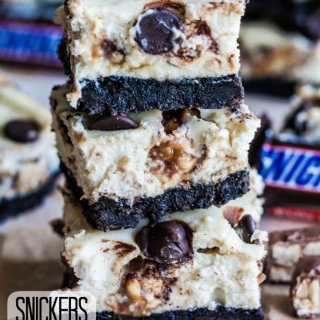 Fold in the chopped snickers and spread over the crust. Top with chocolate chips and bake it doe 30-35 minutes or until cheesecake is set.