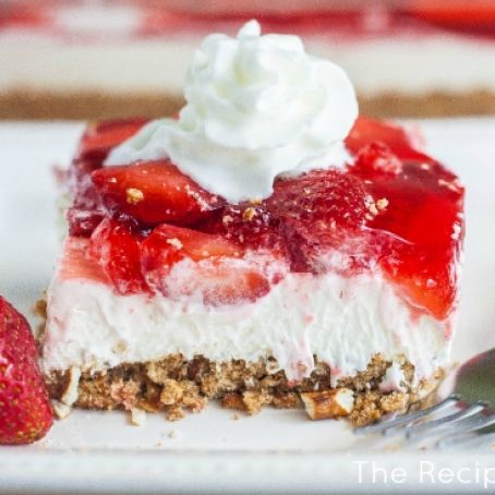 Beat the cream cheese and sugar together until creamy. Fold in the cool whip. Spread the mixture over the top of the pretzel crust completely to the edges so the jello won’t leak through.