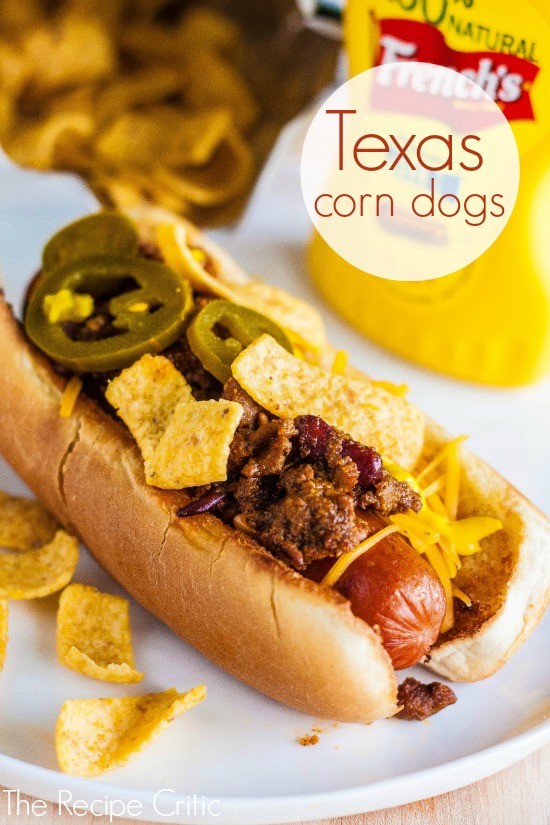 Heat the hotdogs on the grill or simmering water. Serve the dogs in toasted buns and top with cheese, chili, lots of fritos, mustard, oinions, and pickled jalepeños.