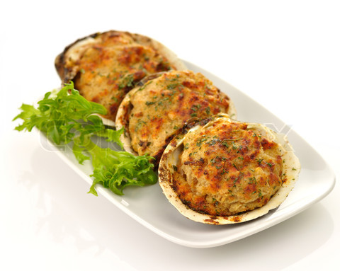 Spoon into shells, sprinkle with parmesan and some breadcrumbs, and bake in oven at 375 degrees until browned.