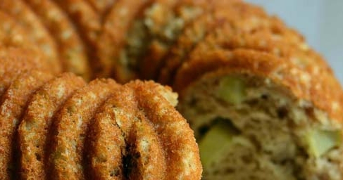 In greased and floured bundt pan, layer some batter, then add a layer of apples, more batter, another layer of apples, and the final batter layer. (there will be 3 layers of batter, and two layers of apples)