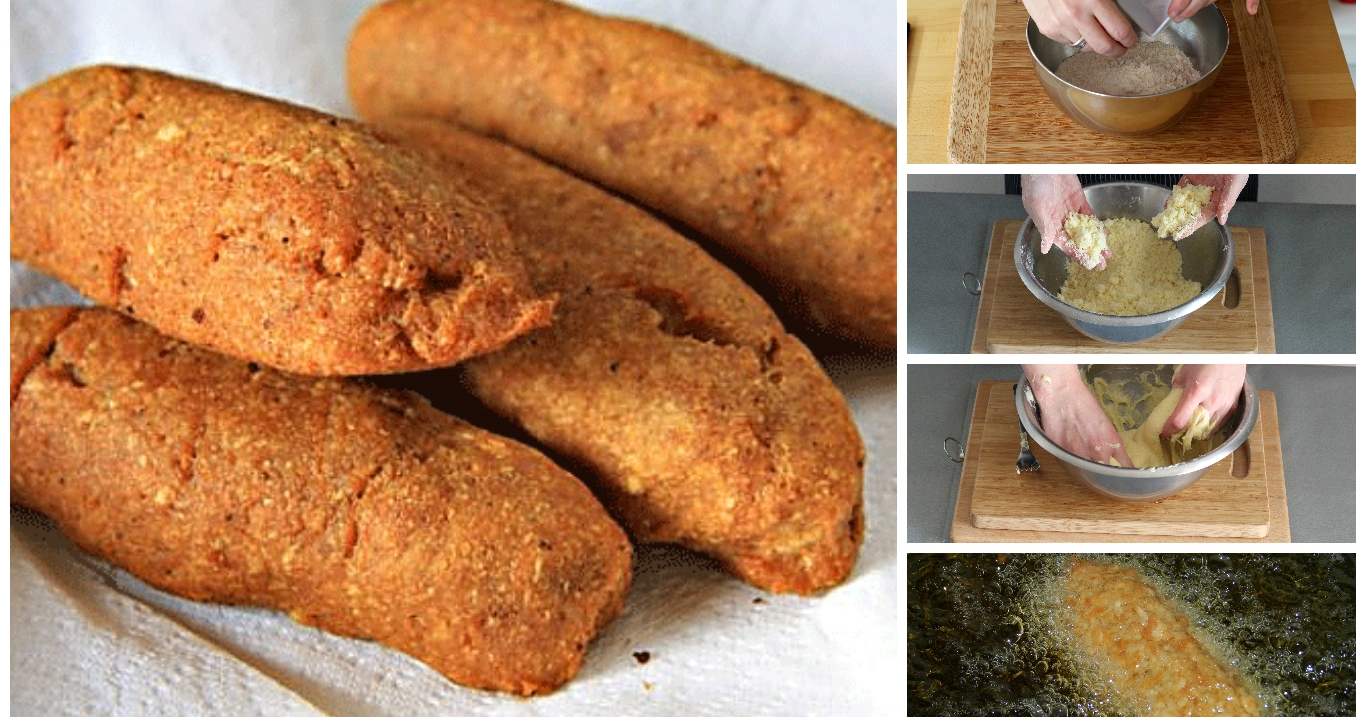Spread about 1/4 cup of the alcapurria dough onto the palm of your hand. Place a tablespoon of the meat filling in the middle and flip one side of the dough over the meat by folding your hand, smooth closed over the meat. Round out in your hand to an oval shape.