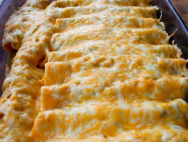 2. Mix chicken and 1 cup cheese. Roll up in tortillas and place in pan.