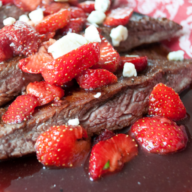 Serve with white rice and neutral colored vegetables, along with the garnish of berries ontop.
