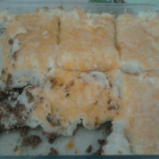 Now that all is prepared, in a glass rectangular pan, place all of the beef on the bottom and try to even it out so that it can cover any open space.