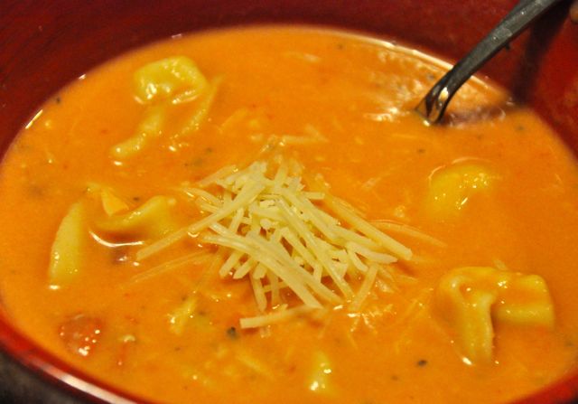 After tortellini are cooked, ladle soup into bowls and top with Parmesan cheese.