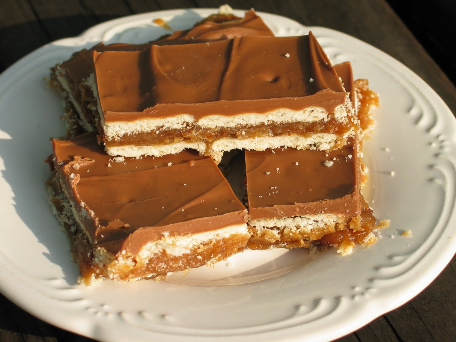 For the chocolate layer: Melt the chocolate in the microwave using ten second increments - stirring every time. If the chocolate seems too thick, add a tablespoon of shortening to thin it. (Just know that this will leave your end-resulting chocolate a little softer than normal. I don't use it for this very reason.) Pour evenly over the chilled caramel layer and spread until it covers the entire surface.