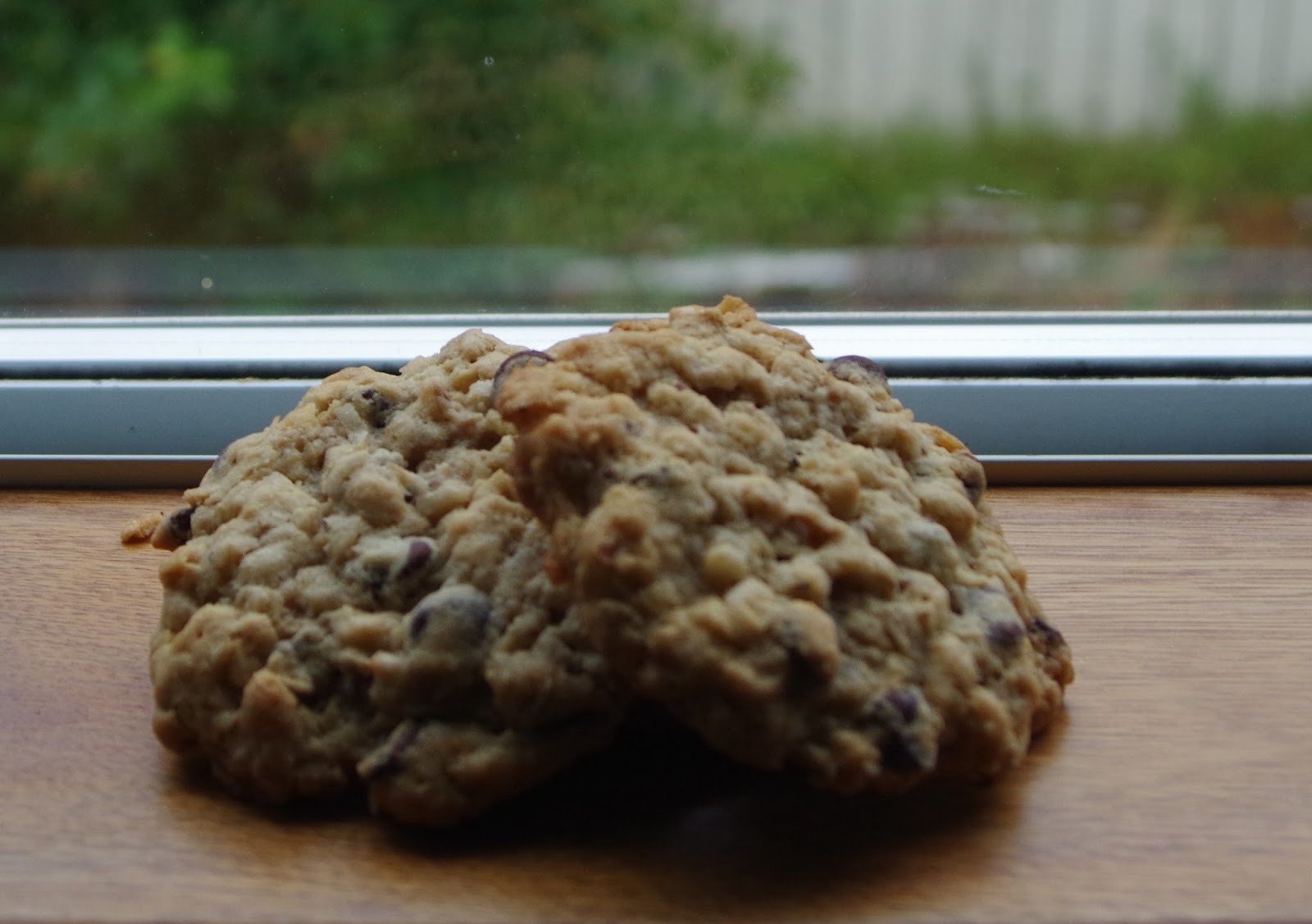 In a large bowl, stir together the oats, flour, baking soda, baking powder, salt, and cinnamon. In a separate bowl, blend the butter and sugars with an electric mixer until smooth, about 2 minutes. Add the eggs and continue to beat until fluffy, about 1-1/2 minutes. Blend in the vanilla extract.