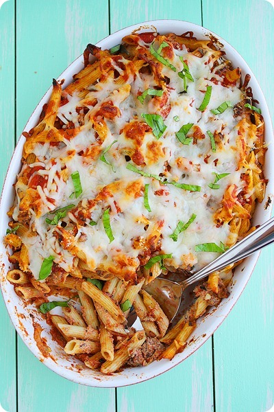 Coat bottom of a large baking dish with 1/2 cup pasta sauce. Add pasta mixture into dish and spread out evenly. Spoon remaining sauce over top and sprinkle with mozzarella. Bake until golden brown and hot throughout, about 30 minutes.