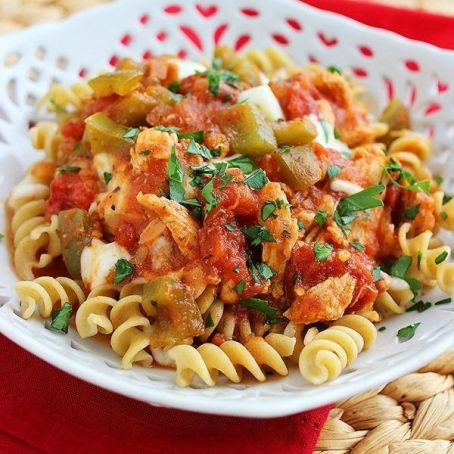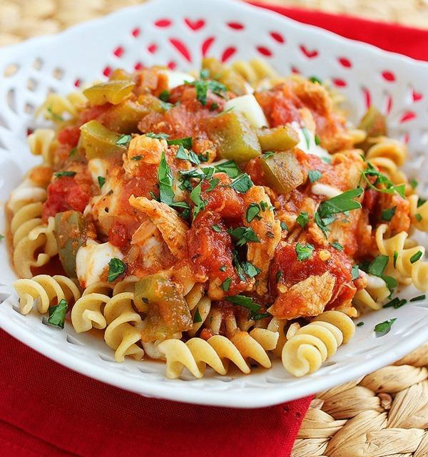 Once cooked, remove chicken and slice into bite-sized pieces. Add back to slow cooker and stir in mozzarella. Serve heaping spoonfuls on top of cooked pasta.