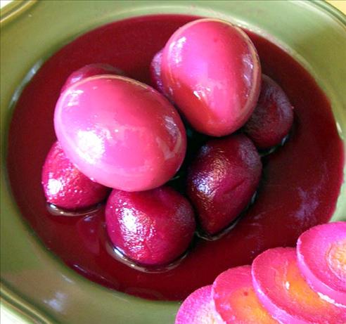 After the 5 minutes, pour the mixture over the eggs and beets while it it still hot.