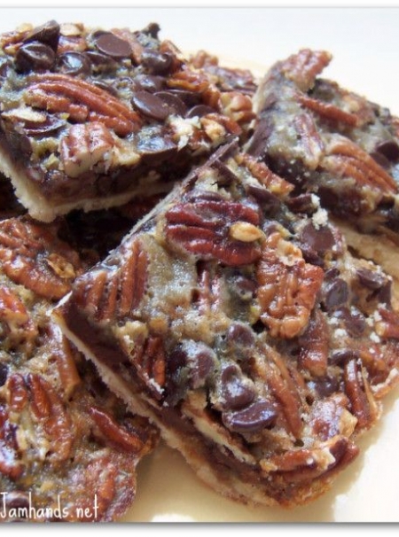 Bake until lightly browned, 25-30 minutes. Let cool, 10 minutes. Meanwhile, in same large bowl, mix eggs, corn syrup, granulated sugar, and 2 TBS melted butter until well combined. Add chocolate chips and pecans; spread over crust.