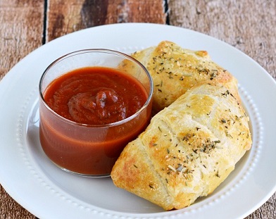 Tuck the sides of the dough under the tip of the dough to create a seal. Brush the top of each pizza pocket with the egg wash and sprinkle with Parmesan cheese and the seasoning.