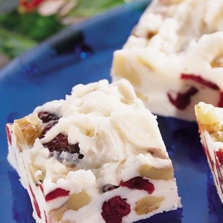 In medium bowl, combine powdered sugar, cream cheese and frosting; blend well. Stir in melted chips, walnuts, cranberries and orange peel. Spread in sprayed foil-lined pan. Refrigerate about 1 hour or until firm.