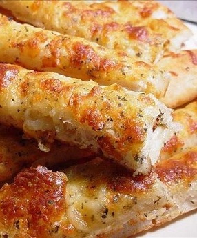 Preheat oven to 425. Unroll pizza dough onto a greased cookie sheet and brush with butter. Sprinkle cheeses and spices evenly over the dough. With a pizza cutter, cut dough lengthwise into 12 long strips. Then cut those in half to make 24 strips.
