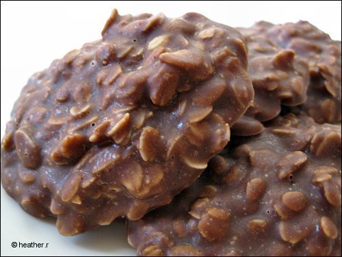 Add oats,peanut butter and butter.Stir quickly and then drop spoonfuls onto wax paper to cool.