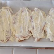 Lay chicken breasts on baking sheet (I line my baking sheet with parchment paper to make clean up easy) and spread mayo mixture evenly atop each.