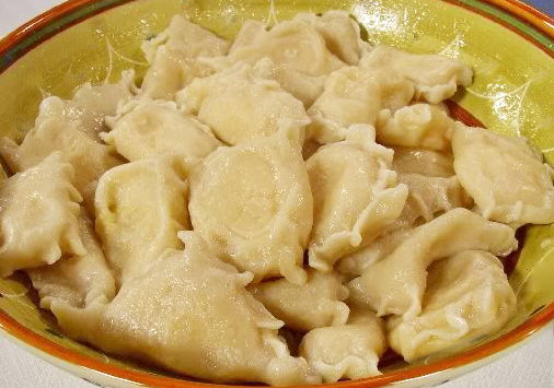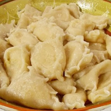 Starting at the side of the rectangle closest to you, about an inch from the bottom, place a long row of potato filling across the dough, not quite to the side edges. (about an inch thick) Brush egg wash in a thin stripe on both sides along the length of the row of potatoes, Fold dough over potato and press together, using the handle of a wooden spoon, press segments into the row, separating into individual bumps, pressing to seal edges.