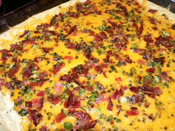 3. Pour into a 9x13-inch casserole dish. Cover with cheddar cheese and crumbled bacon. Bake until cheese is melted.