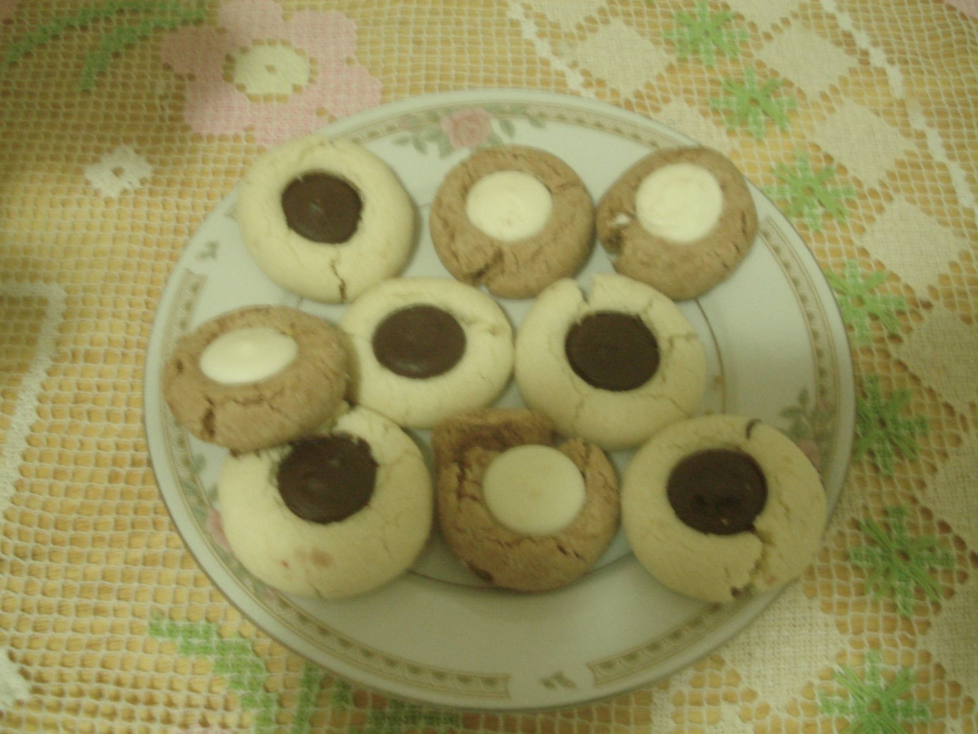 BAKE 20 AT 25 MINUTES, REMOVE FROM OVEN AND PRESS WITH CHOCOLATE INTO COOKIES TO MAKE DEEP ANS SITE ASIDE TO FIRM UP.