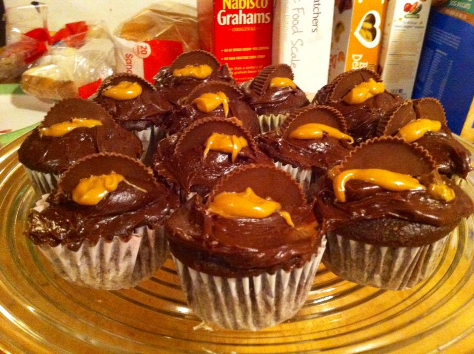 Use left over Peanut Butter filling to dab on top of the cupcakes. It helps the peanut butter cup stay on.