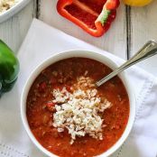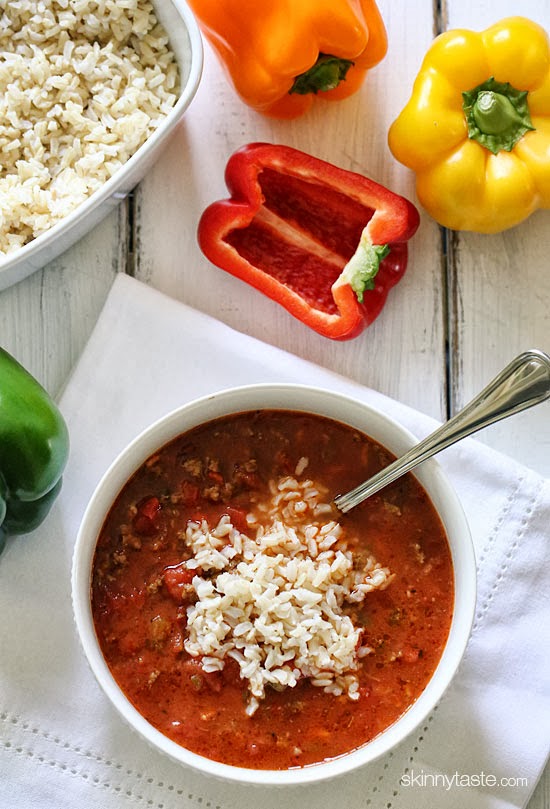 This is a hearty bowl of soup that will fill you up and warm you on a chillynight. I guess you can call this a lazy stuffed pepper because it tastes just like a stuffed pepper without all the extra work. Topped with brown rice it's a satisfying meal. Heck, if you wanted you could even make this with ground turkey, and top it with shredded cheese. Have fun with this one