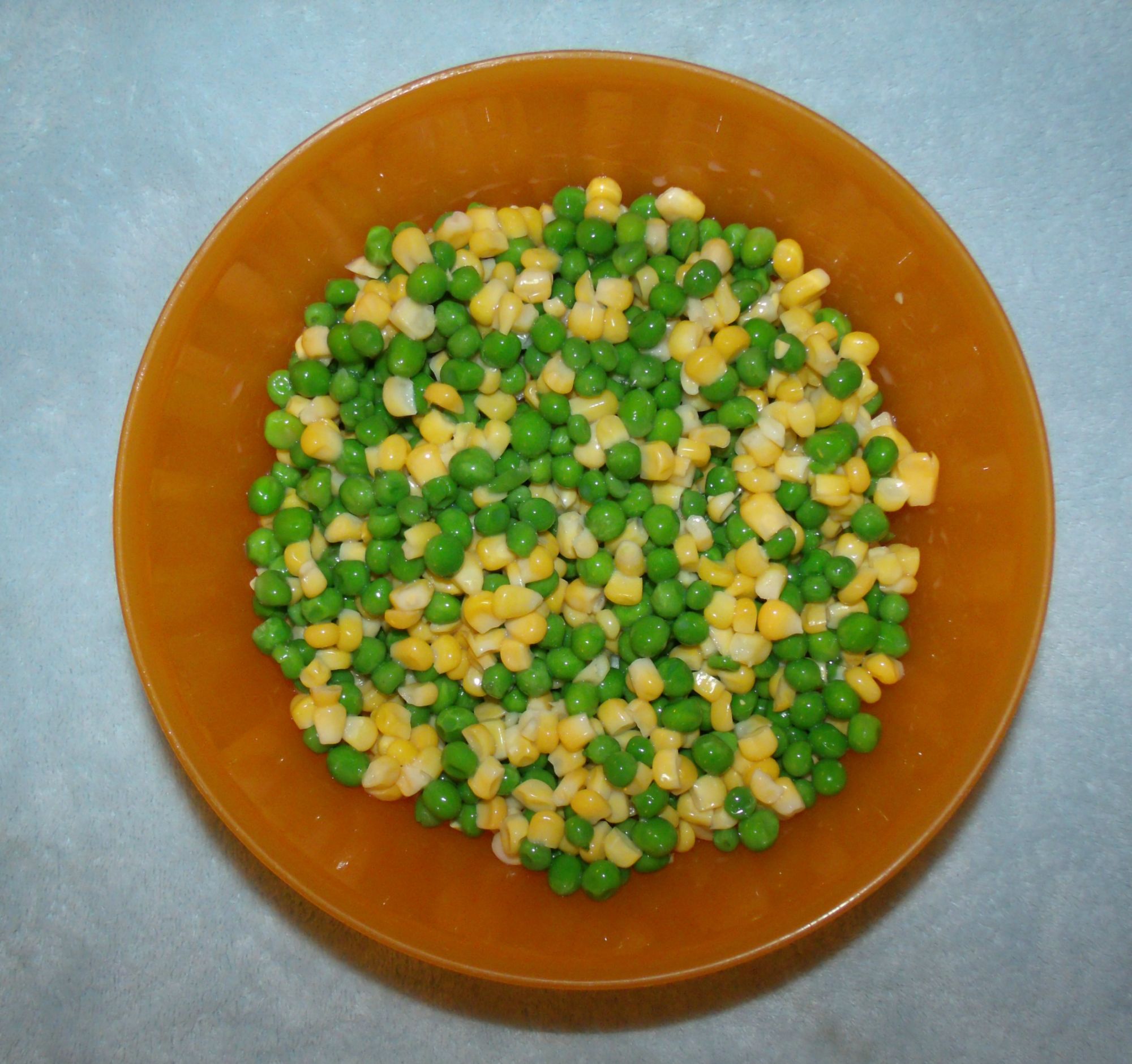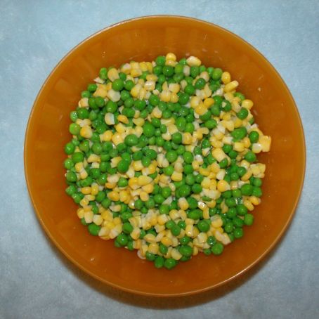 Combine 2 cups of frozen peas and 2 cups of frozen corn in a bowl. Mix well