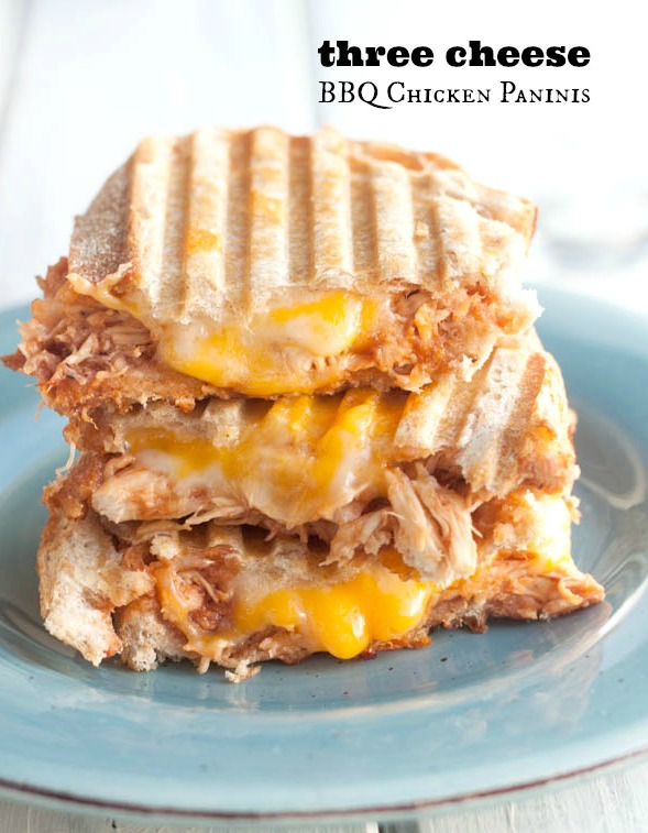 I made these Three Cheese BBQ Chicken Paninis last week for dinner and was somewhat surprised at how much my family liked them. I mean, they’re just so simple.I kept these really simple by using a rotisserie chicken (I’m slightly obsessed with rotisseries- they’re making my life easy right now), shredded it up and tossed it in some bbq sauce. You can grill these up on a panini press, griddle or just the stove top. I love how quickly the panini press makes a perfectly toasted sandwich with perfectly melted cheese