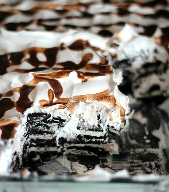 Dip 30 Oreo Cookies in milk one by one and lay flat in a 9x13 pan.