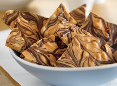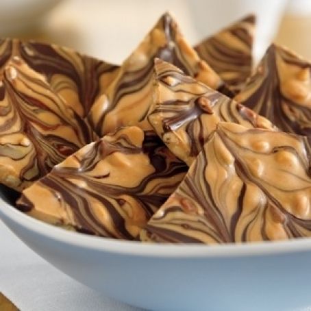 Immediately place peanut butter chips and shortening in second microwave-safe bowl. Microwave at MEDIUM 1 minute; stir. If necessary, microwave at MEDIUM an additional 15 seconds at a time, stirring after each heating, until chips are melted and mixture is smooth when stirred; stir in peanuts. Alternately spoon above mixtures onto prepared tray; swirl with knife for marbled effect. Gently tap tray on countertop to even out thickness of mixture. Refrigerate about 1 hour or until firm. Break into pieces. Store in cool, dry place. About 1 pound candy