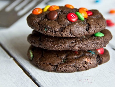 In a stand mixer, cream the butter for 20 seconds. Add the sugars, and cream until light and fluffy, about 2 minutes. Add the egg and vanilla, mix until combined. Mix in the flour, cocoa powder, baking soda and salt. The dough should be pretty thick. Using a spatula, mix in the milk. Stir in 1 cup of mini M&M’s.