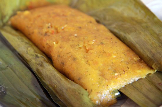 Using a large cooking spoon, place about 1/2 to 3/4 cup of the masa in the center of the banana leave and smear it around in a circular motion.