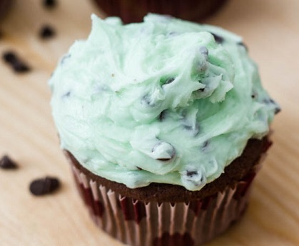 Make the frosting: beat softened butter on medium speed with an electric mixer. Beat for about 30-60 seconds until smooth and creamy. Add 3 cups of powdered sugar, milk, peppermint extract, and food coloring. Increase to high speed and beat for 3 minutes. Add more powdered sugar if frosting is too thin (up to 4 cups) or more cream if mixture is too thick. Add salt if the frosting is too sweet. You may also add more food coloring if desired or more peppermint extract if it is not minty enough. Stir in the chocolate chips by hand.